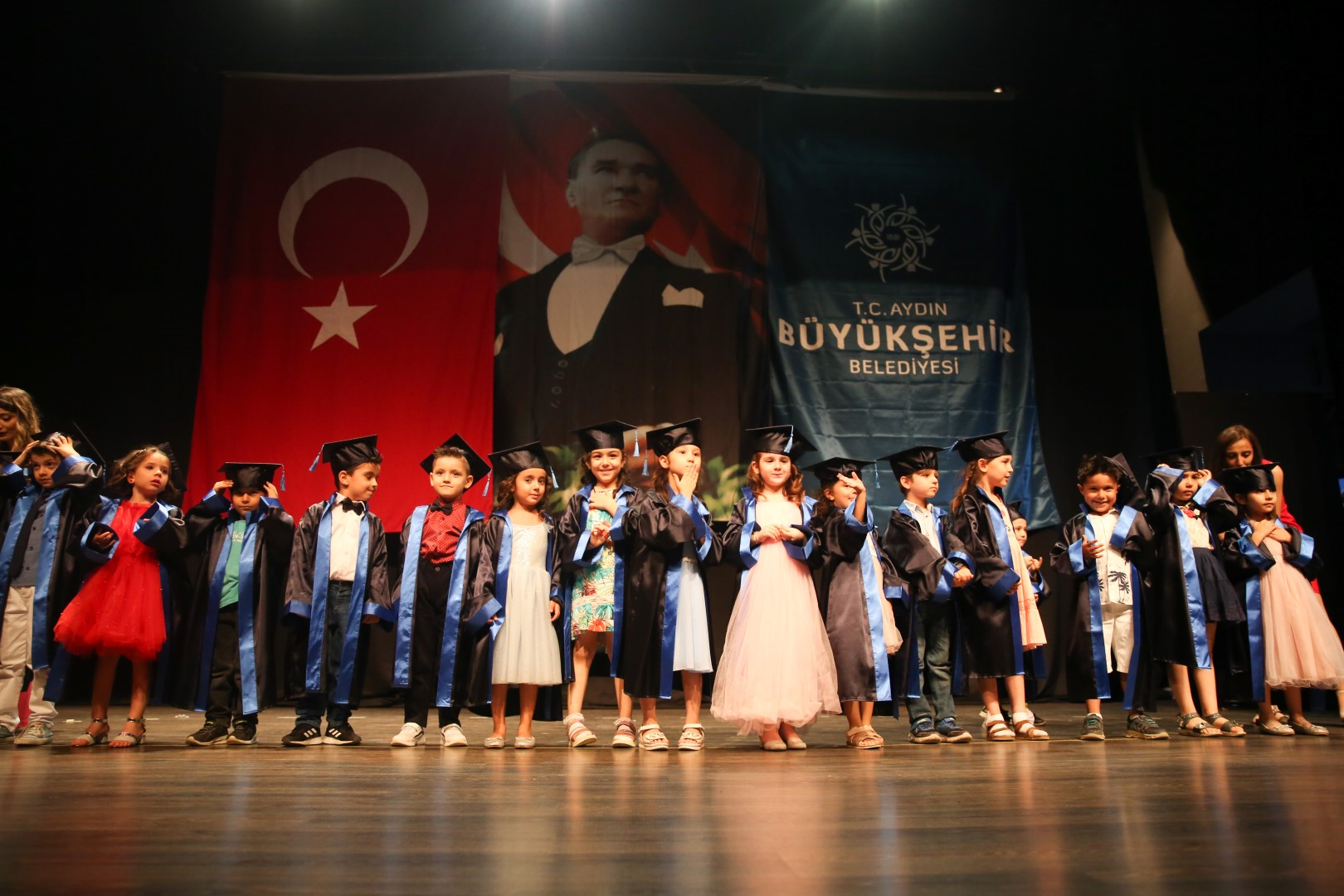 Aydin merkezde iki merkezle minikleri gelecege hazirlayan Aydin Büyüksehir Belediyesi’nin çocuk gelisim merkezleri ilk mezunlarini verdi. Sükran Güngör-Yildiz Kenter Kültür Merkezi ve Tiyatro Salonu’nda düzenlenen törende çocuklar hem eglendi hem de velilerini gururlandirdi. Kep atarak egitimlerinin ilk adimlarini basariyla bitiren çocuklar, geçen yil boyunca ögrendiklerini de sergileme firsati buldu. Çocuklar gece sonunda da temsili diplomalarini aldi.