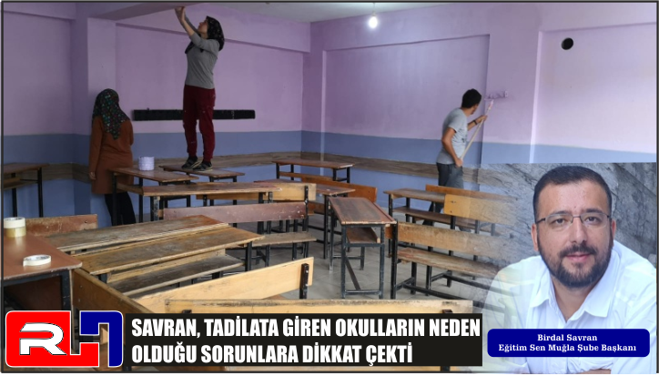 Eğitim Sen Muğla Şube Başkanı Birdal Savran, Muğla’da eğitimin başladığı sıralarda bazı okulların tadilata girdiğini, bu nedenle öğrencilerin mağdur edildiğini söyledi. Savran, ‘Tadilatlar nedeniyle ikili öğretim uygulanan okullarda okula başlama saatleri çok erken, bitiş saatleri ise çok geç oluyor. Teneffüs sürelerinin kısa olması ve blok ders uygulamasıyla çok uzun ders süreleri öğrencileri ve velileri mağdur ediyor’ dedi.